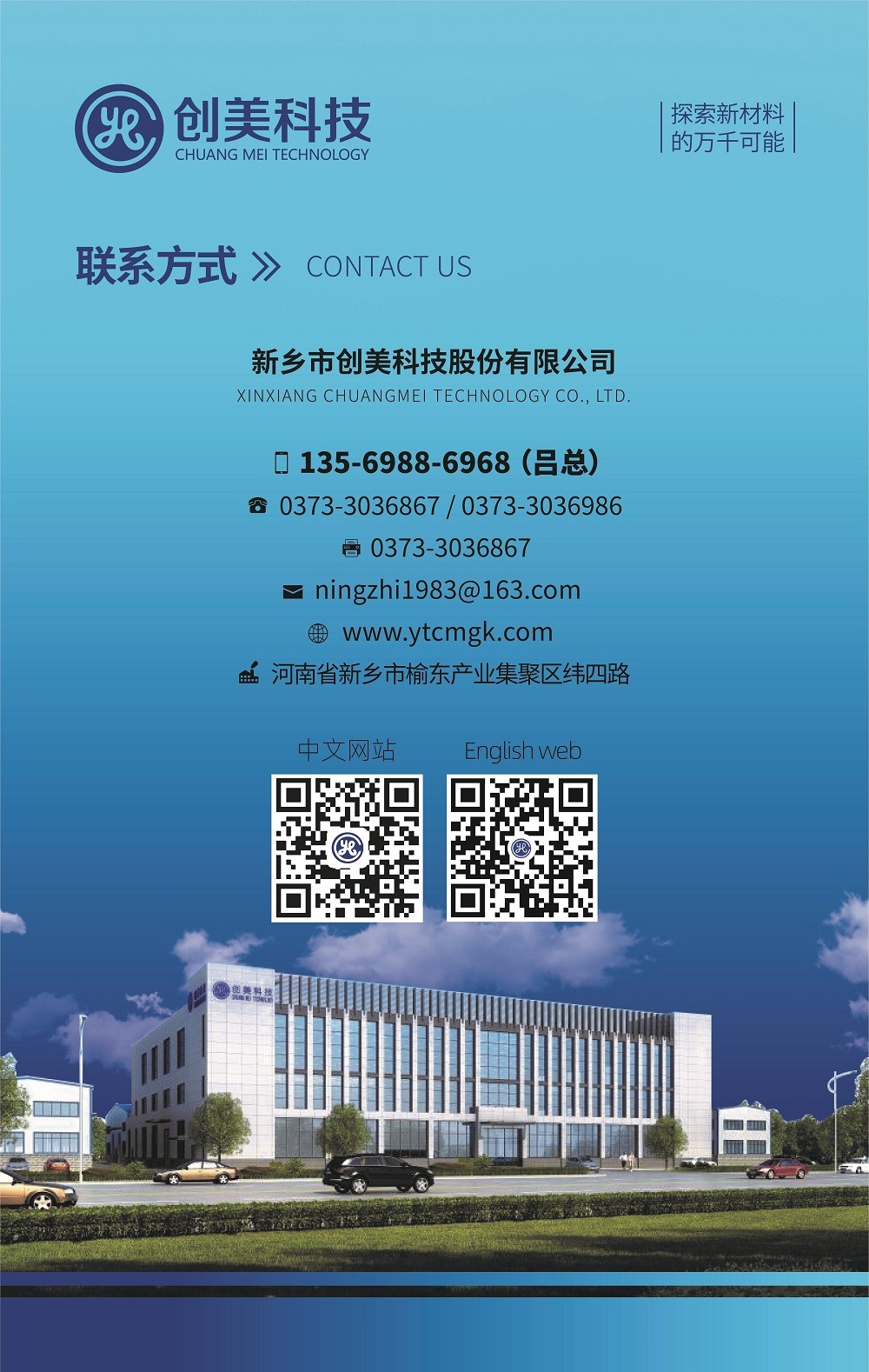 新鄉(xiāng)市創(chuàng)美科技股份有限公司17年專注于研究高分子聚合物,您身邊的高性能材料解決方案供應(yīng)商!